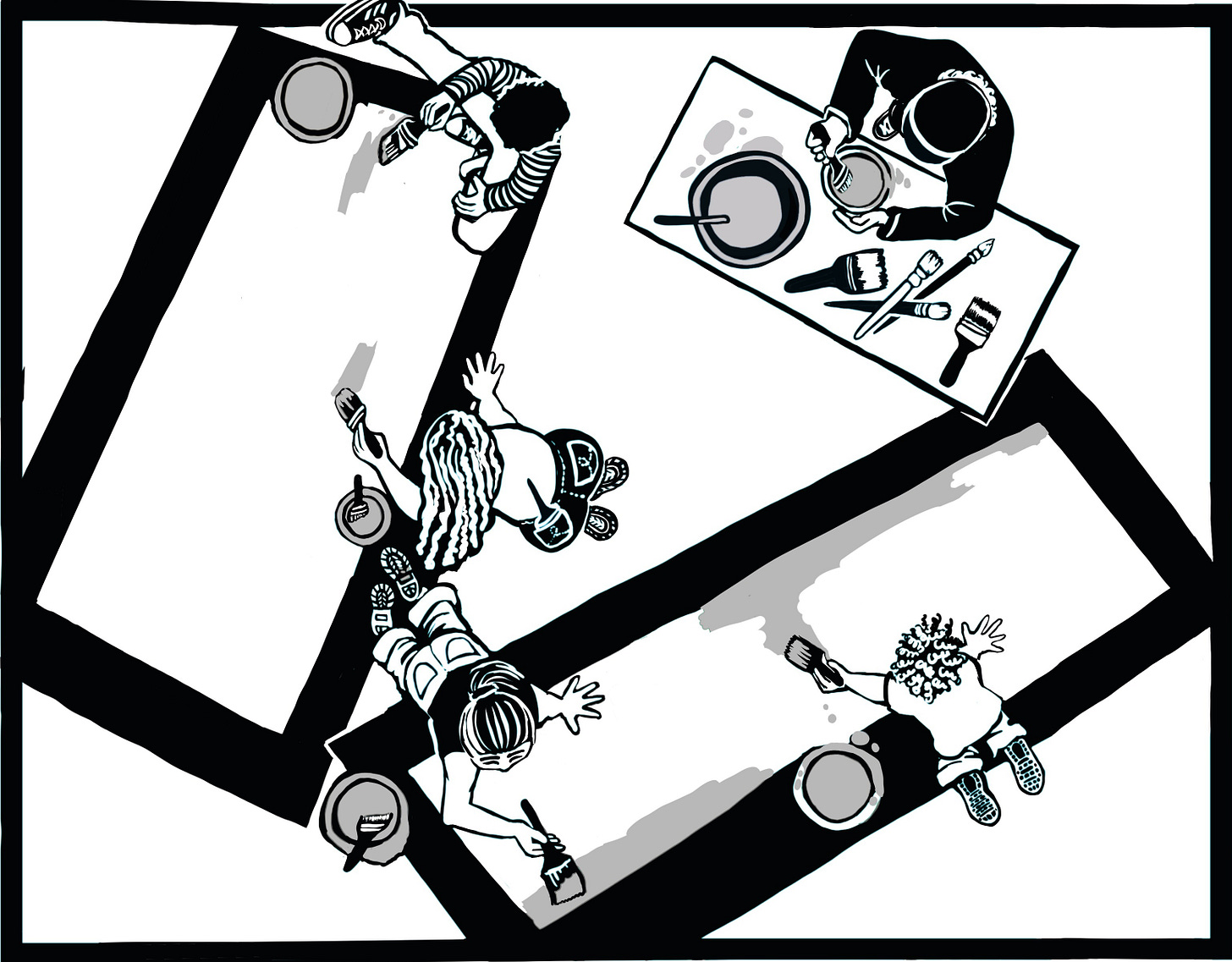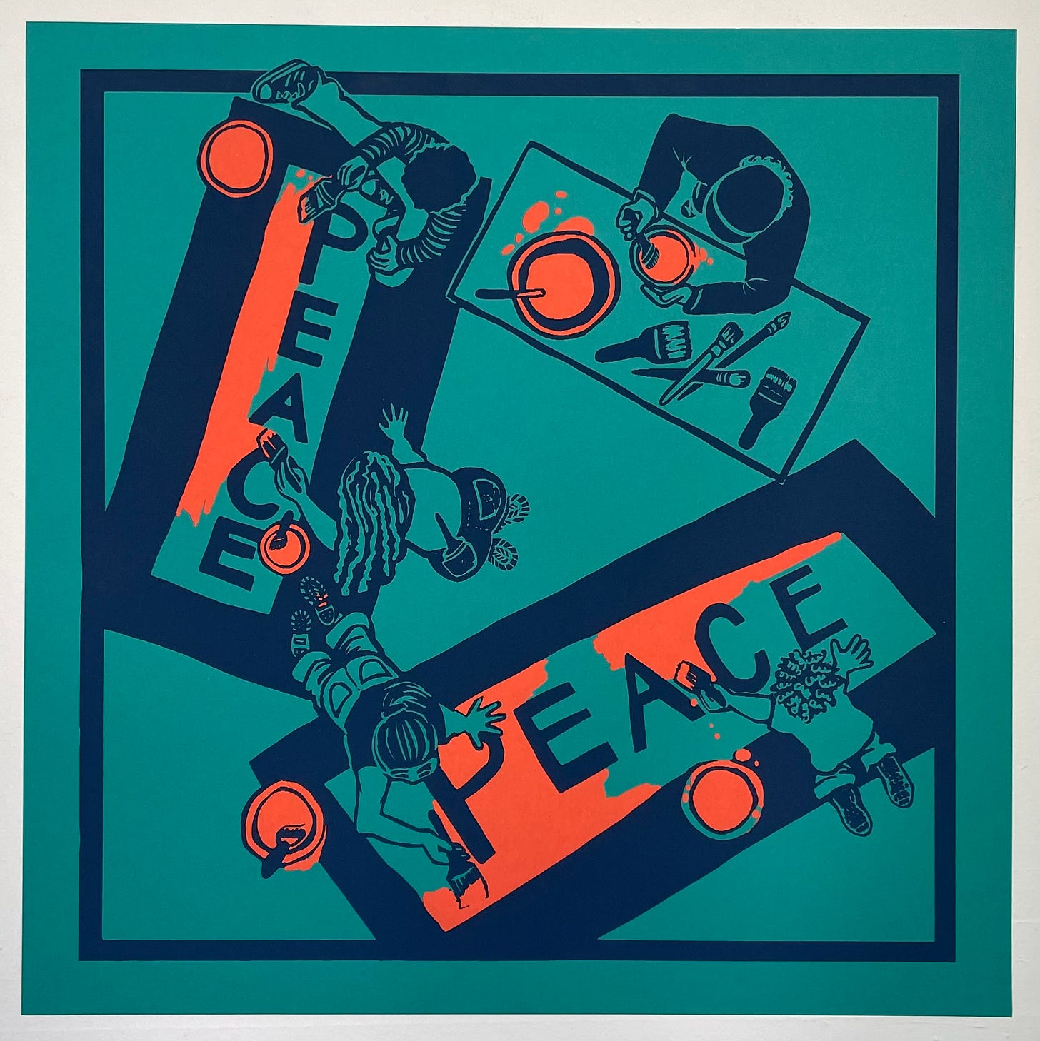 When I drew this month’s new piece, We Organize, I had no idea of where we’d be at right now. It was inspired by the beautiful banners and street murals created by my neighbor David Solnit and so many others. I was inspired reflecting on all the times I’ve felt helpless to do anything and then gathered with others to do something. “Peace” to me is not passive hope. Peace takes grit, and hard decisions, and standing up for one another. Real peace doesn’t dehumanize anyone. Real peace is fiercely protective.