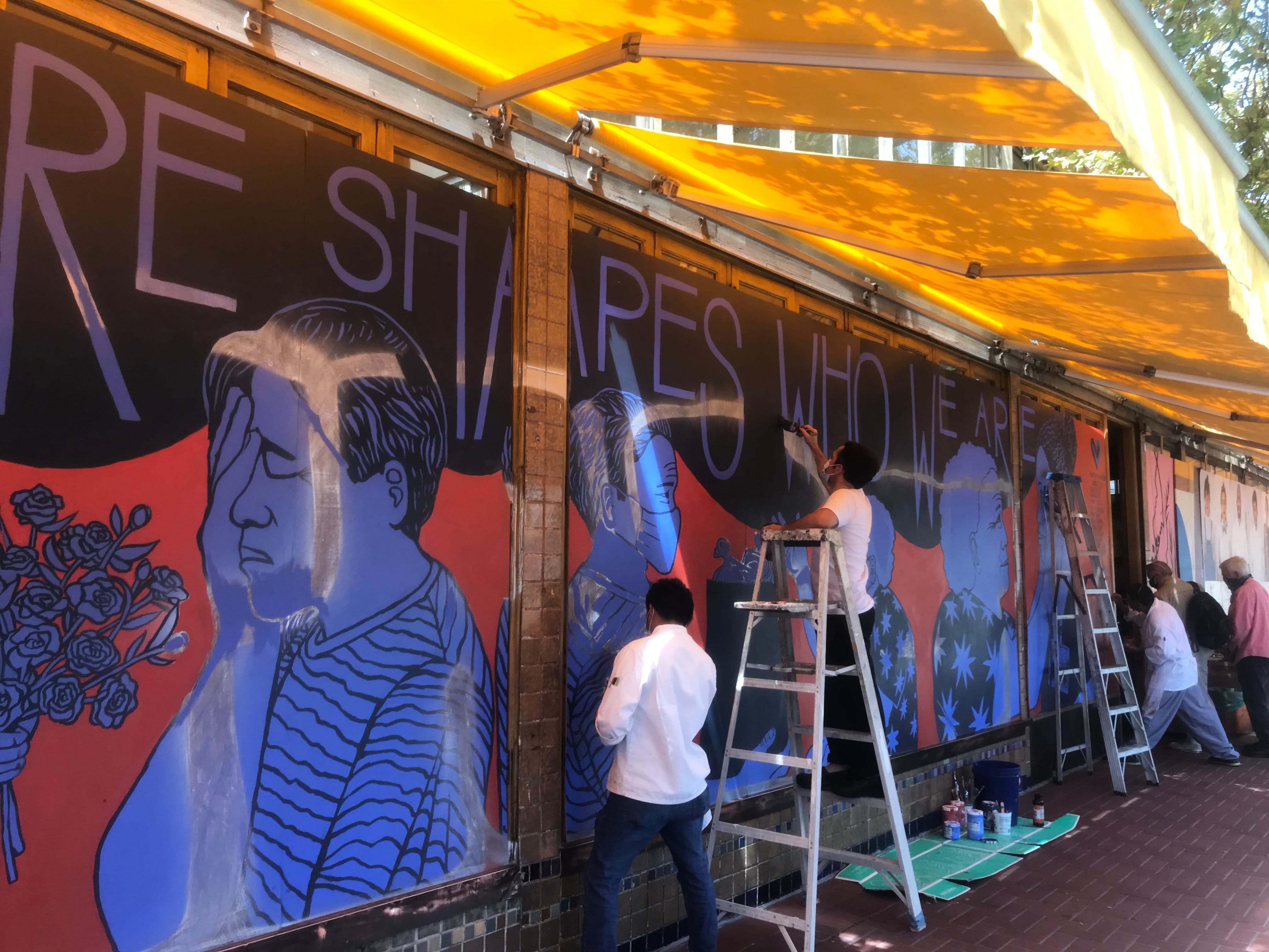 A couple minutes later, one of the sous chefs walked out of the restaurant, and offered to help. We painted and chatted about our similarly aged kids and the challenges of online school. Then a dishwasher finished his shift and came out and offered to join us. As the hours went on, another staff member showed up and another. A staff member who had worked there for 20 years told me about how her kids had grown up at Zuni, and were now struggling to deal with the disappointment of online college. The chef grabbed a ladder to help paint the lettering, and told me about his struggles to keep the restaurant going, the staff employed and healthy, and his efforts to keep buying from the farmers and vendors who were depending on his business, despite the drop in customers. They were cooking 400 meals a day. In the past, these would have been served to customers, but now, most are being delivered people in need.