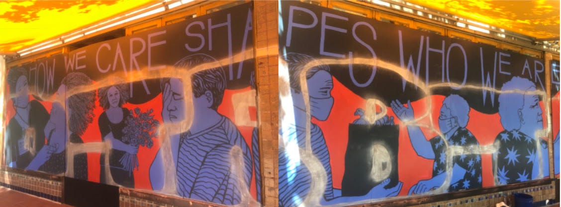 I woke up to a beautiful Saturday morning. The unusually hot weather beckoned outdoor adventures with my kids, but I opened my phone to see a distraught message from the chef at Zuni Cafe. It included an image of a huge tag spray painted over our “How We Care” mural, the one I painted last month with Paint the Void and ER doctors from SF General.