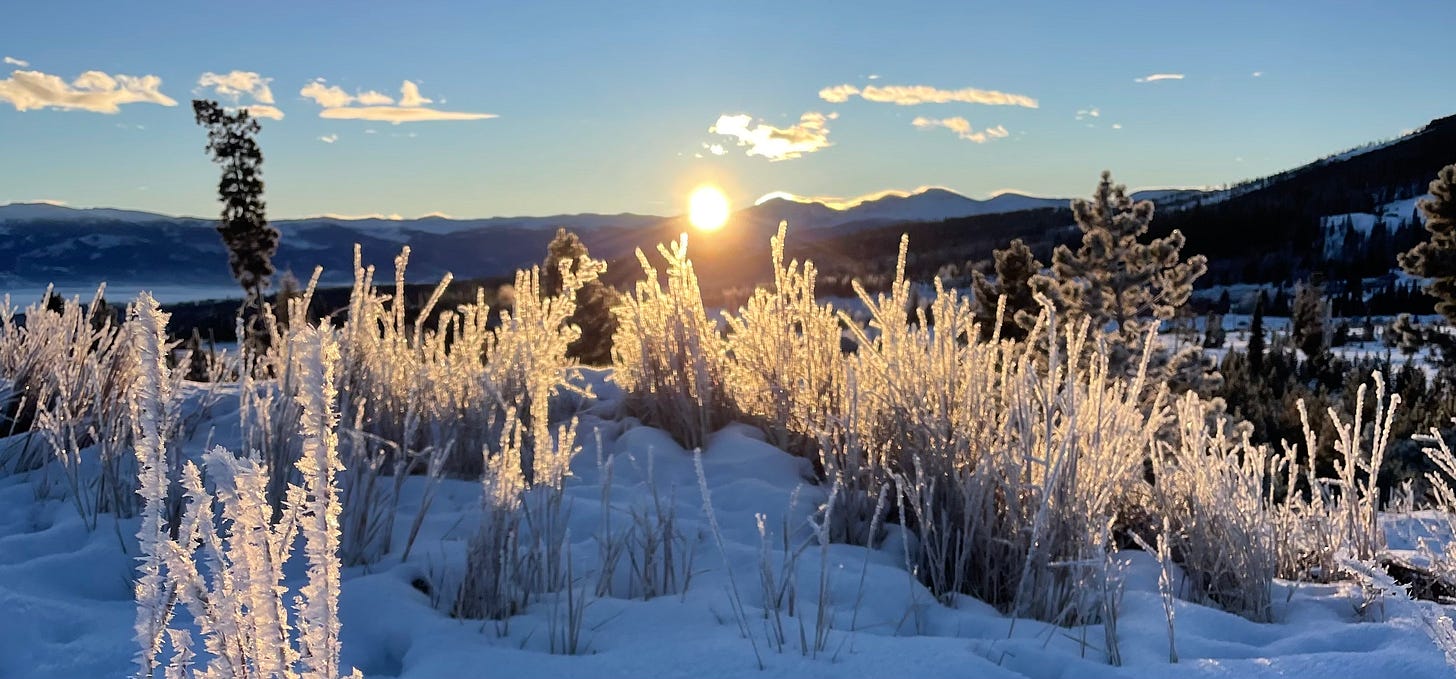 I took a walk early on January 1st and got to see the first light of 2024 coming up behind the Colorado Mountains where I grew up. Each blade of the crystallized yellow grasses were lit up by the early morning light, which moments before had been hidden in the shadows. It was stunning.